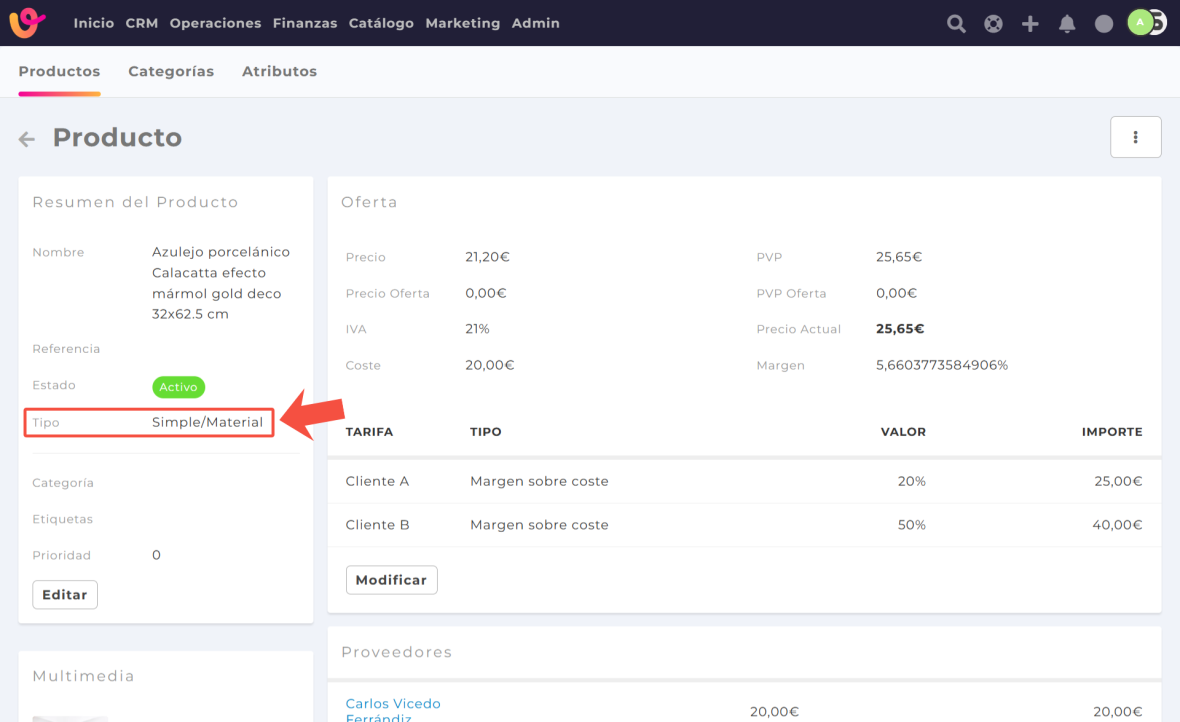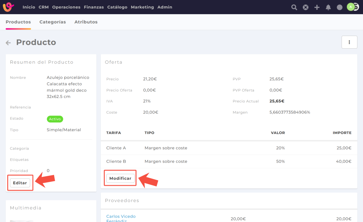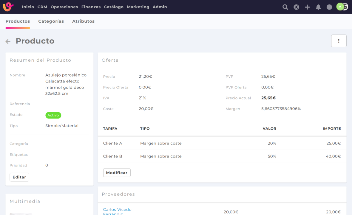 Un producto puede estar vinculado a uno o más contactos de tu base de datos, a modo de proveedor de dicho producto. Esto permite indicar el precio de coste del producto para dicho proveedor, además de indicar el código de referencia que utiliza para identificarlo.
