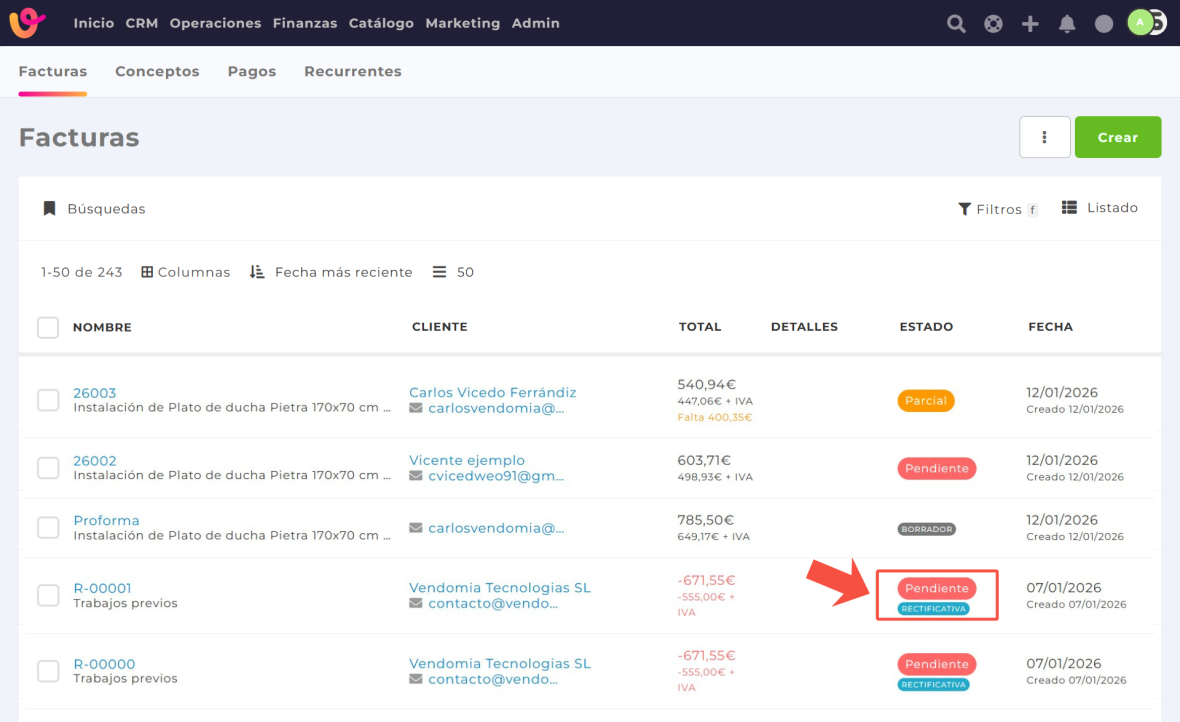 Al cancelar una factura, Vendomia crea automáticamente una factura rectificativa, que deja constancia del cambio y asegura que tu facturación siga cumpliendo con los requisitos legales.