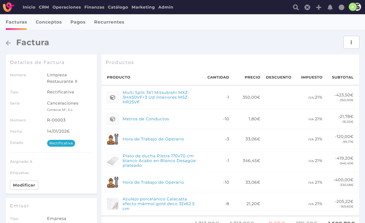 Si has emitido una factura y detectas un error (por ejemplo, un precio incorrecto, un producto mal asignado o un cambio en el cliente), lo correcto es crear una factura rectificativa.