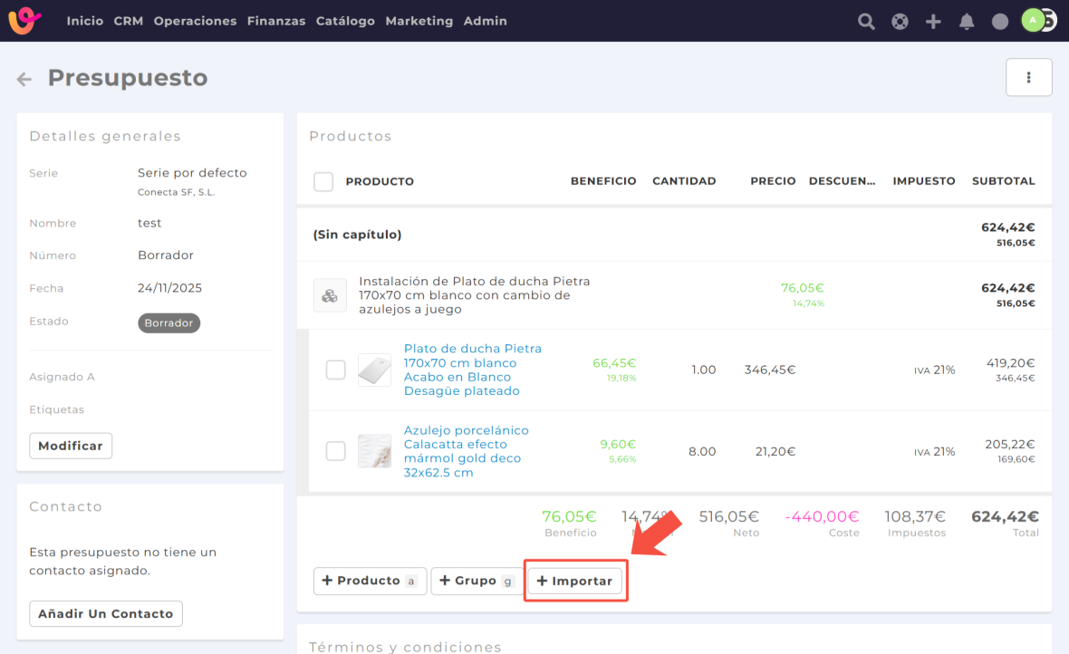 Vendomia insertará automáticamente todas las líneas en tu presupuesto, manteniendo la estructura de grupos y productos según tu selección.