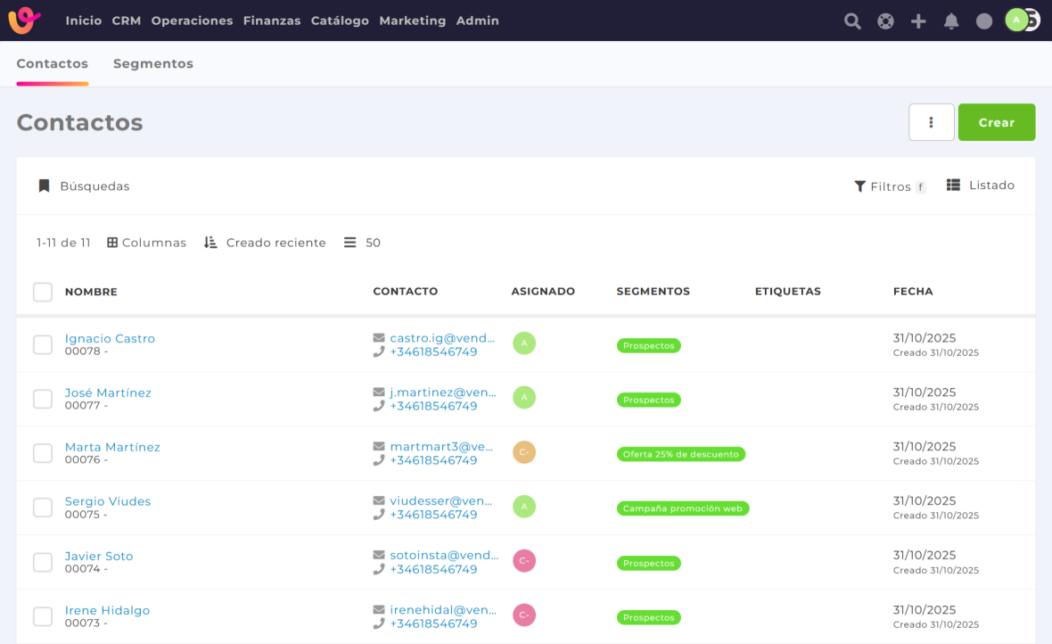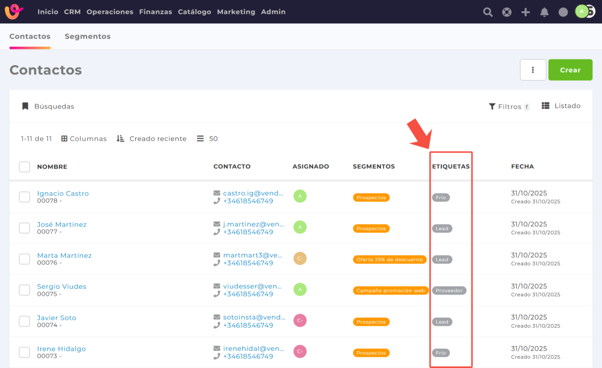 Estas etiquetas son filtrables, lo que facilita la segmentación y búsqueda dentro del módulo de contactos.