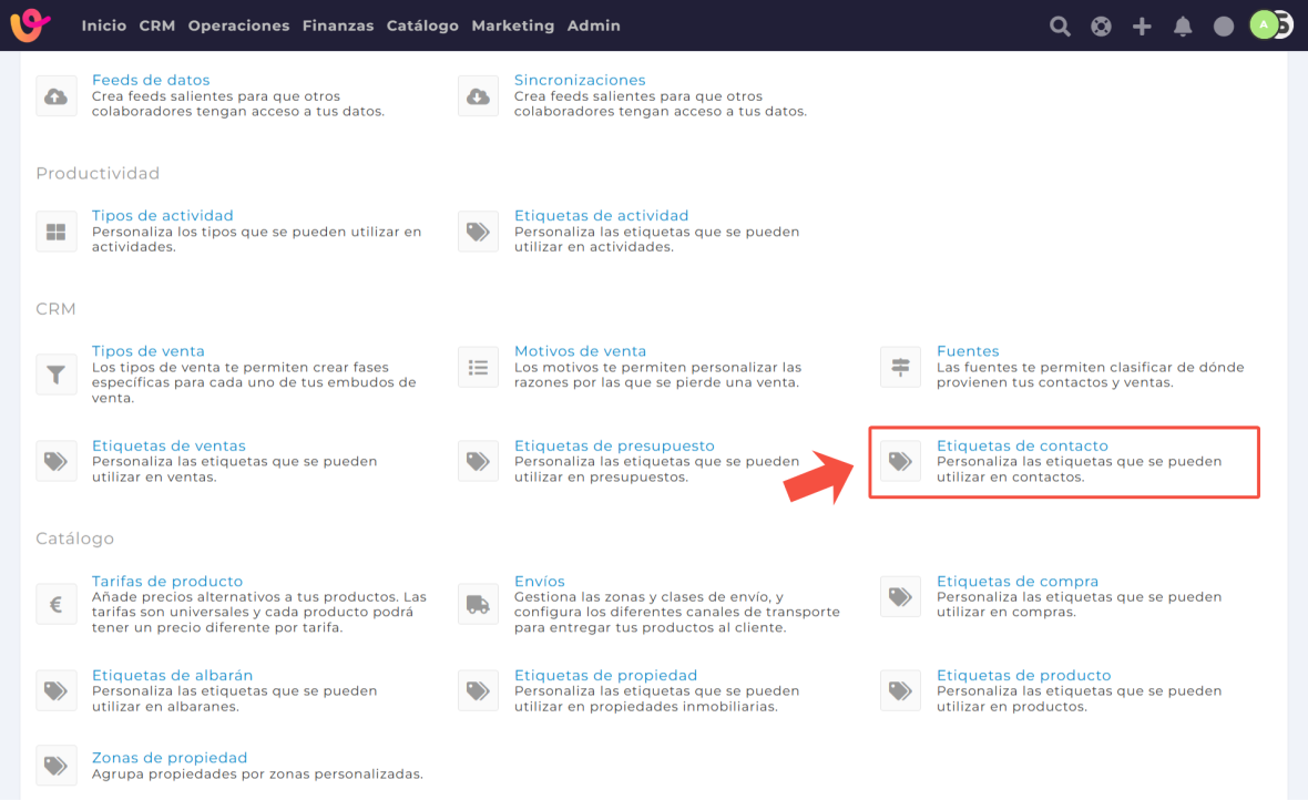 Las etiquetas de contacto permiten categorizar a los contactos con términos específicos (Ej.: Lead, Frío, Proveedor, etc.).