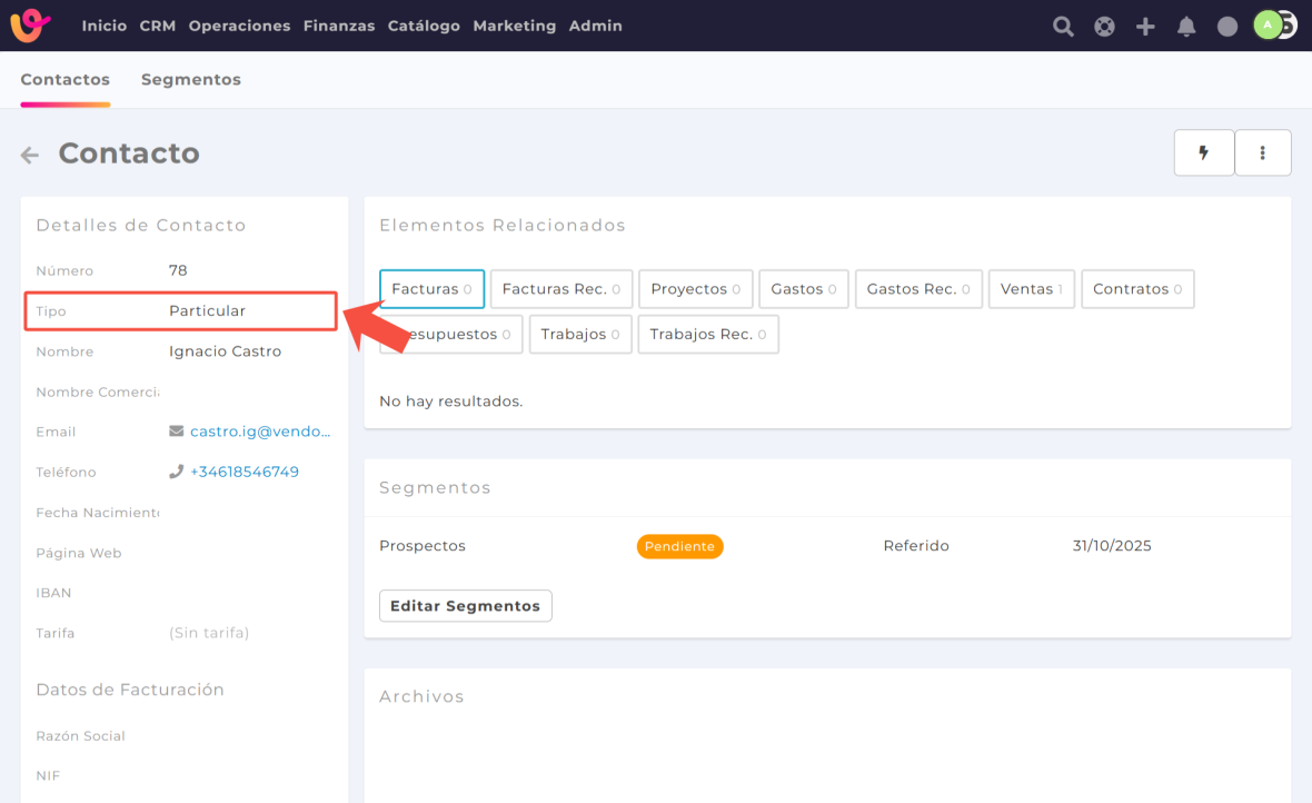 A cada contacto se le pueden asociar documentos generados en la plataforma, como facturas, presupuestos, partes de trabajo o ventas.