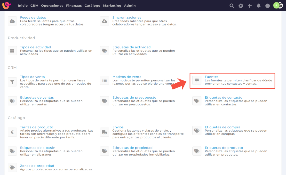 Dirígete a Admin → Configuración y, dentro de la sección CRM, busca el apartado Fuentes. También, puedes acceder directamente desde este enlace: