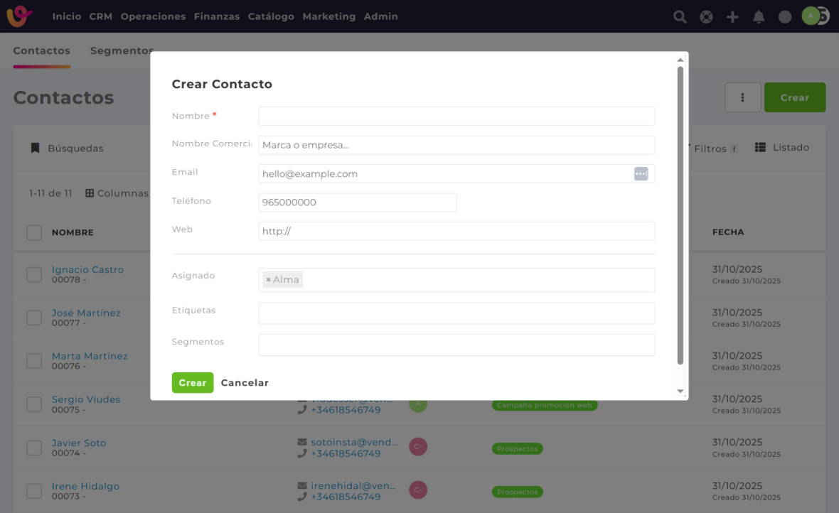 - Desde el módulo de contactos: creando un nuevo contacto manualmente.
