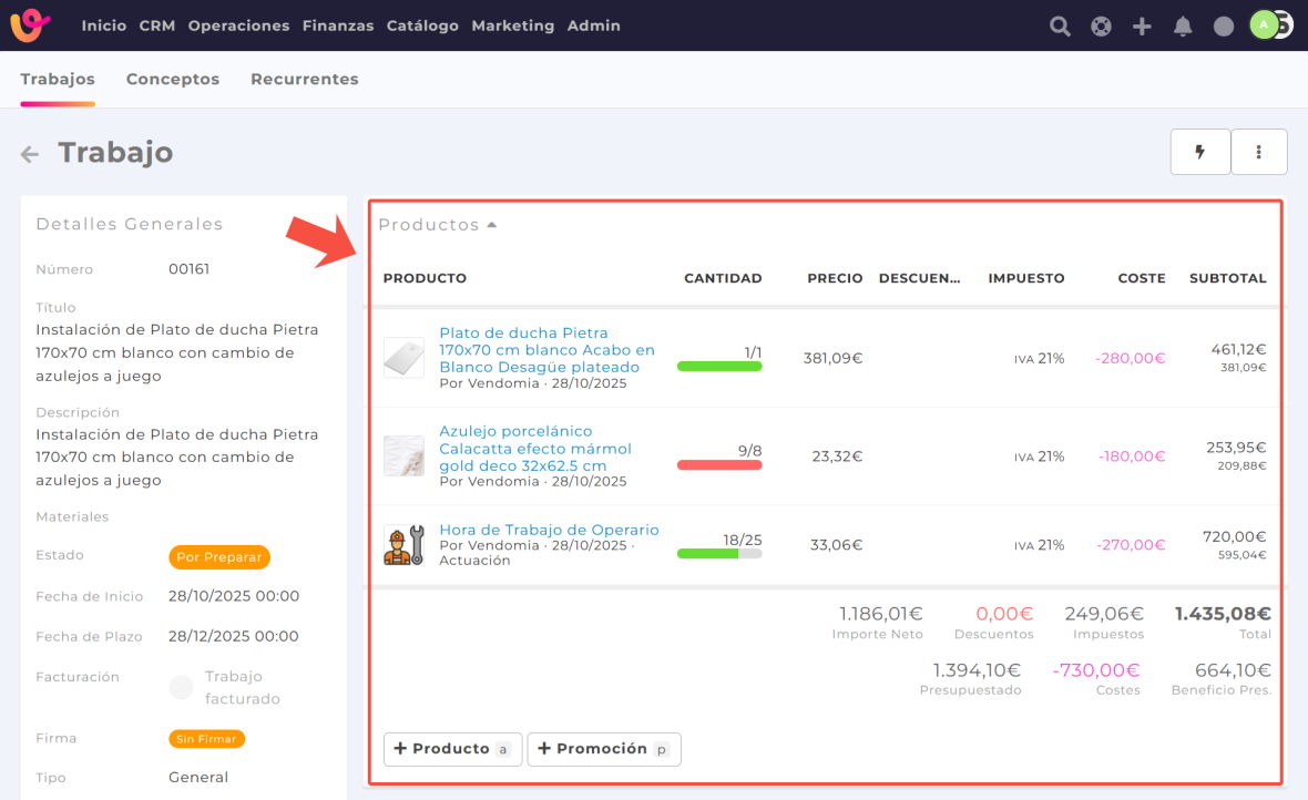 El total de productos de un trabajo refleja el valor de venta y el coste económico de realizarlo, además de servir para controlar el stock de materiales.