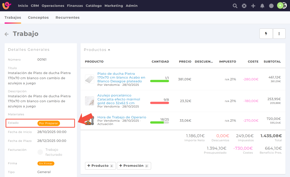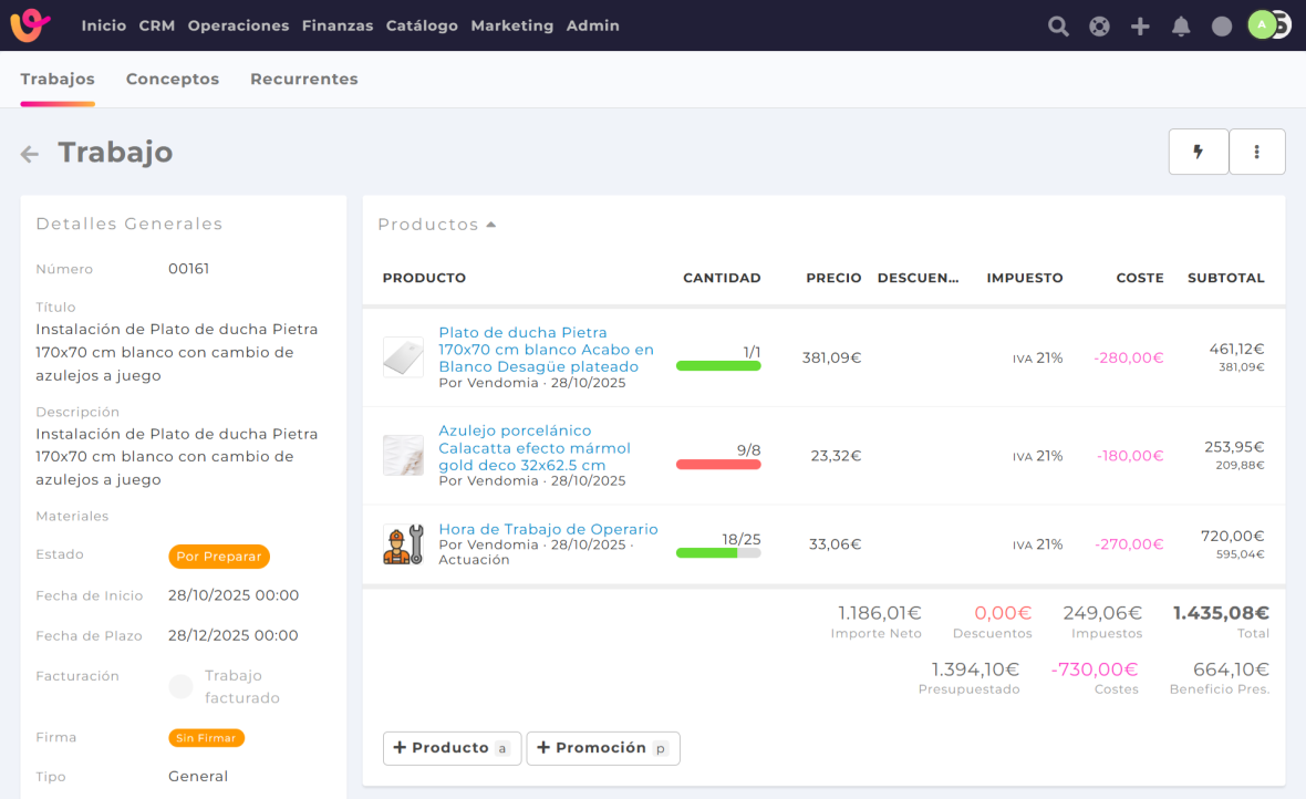 Los trabajos son esenciales en Vendomia porque conectan toda la información: presupuestos, proyectos, partes de trabajo, materiales, tareas y facturación.