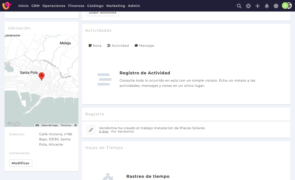 Cada trabajo en Vendomia puede tener asignada una ubicación exacta, indicando dónde debe realizarse. Esto es especialmente útil para empresas que operan en diferentes zonas o con equipos de campo.
