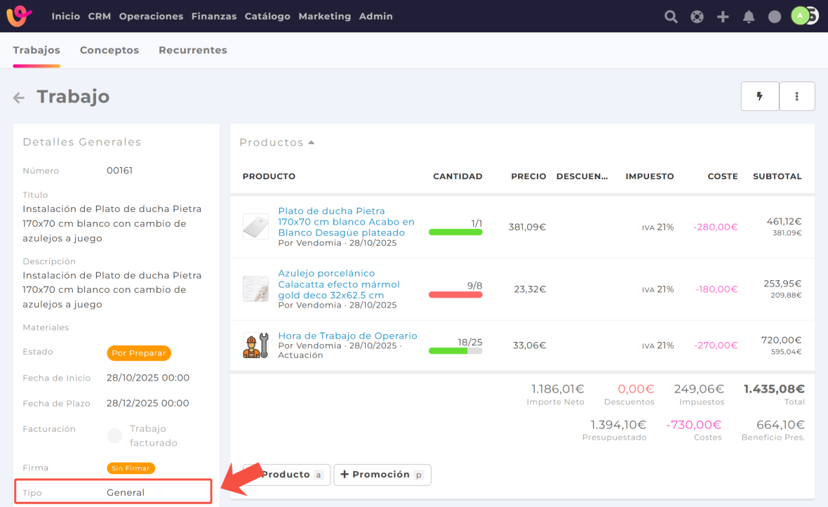 Una vez configurados, los verás disponibles en el campo Tipo al crear un nuevo trabajo.