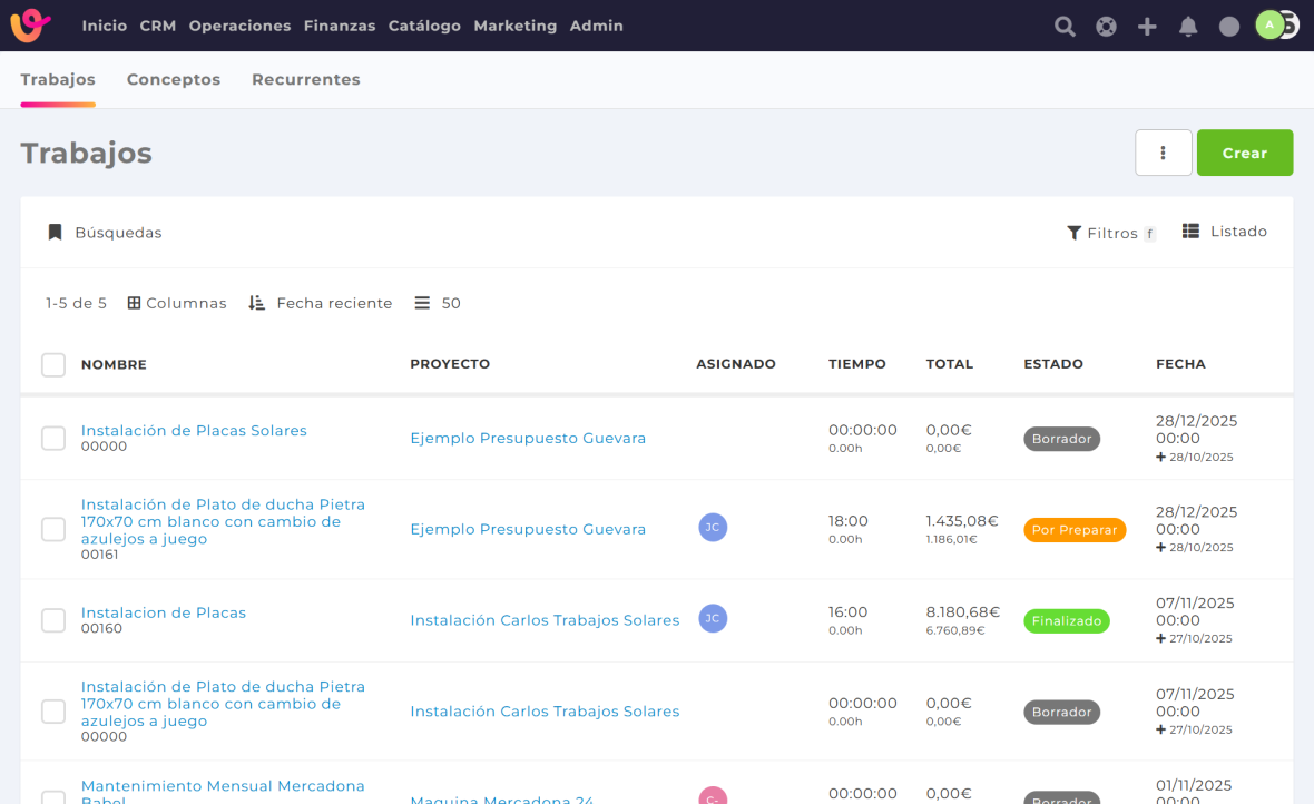 Gracias a los trabajos, puedes llevar un control real y detallado de la actividad diaria de tu empresa: qué tareas están activas, cuáles están finalizadas, quién las está realizando y cómo avanzan respecto a los plazos previstos.