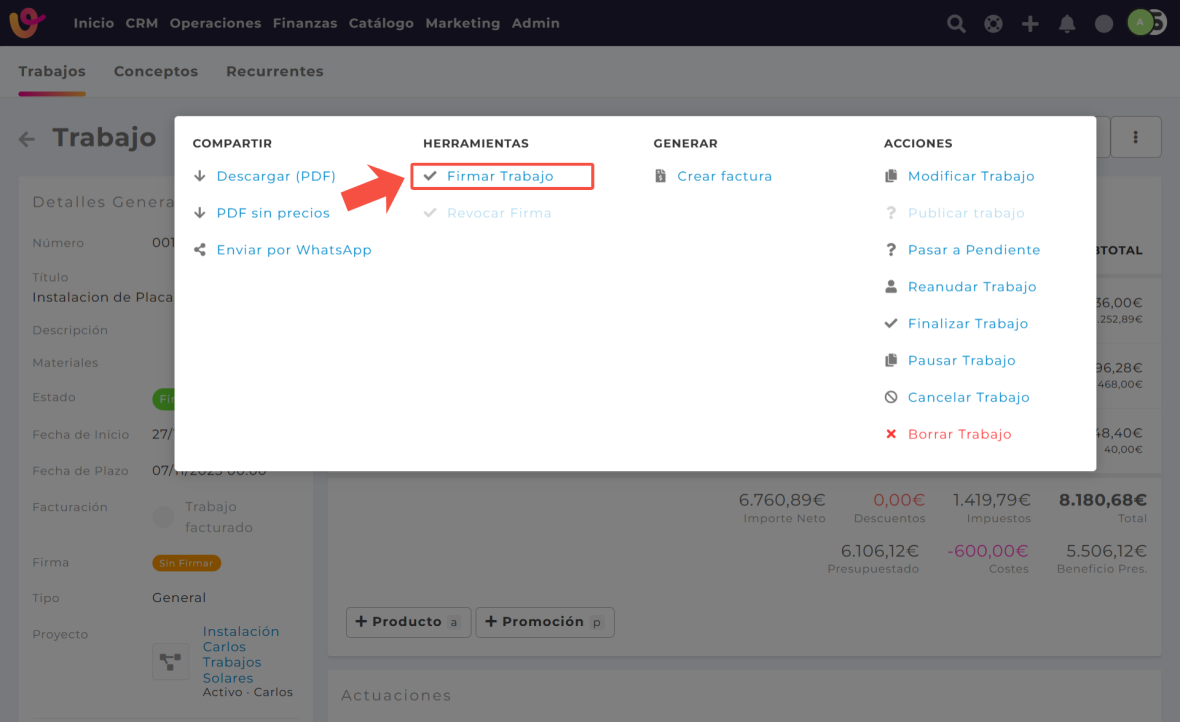 - Selecciona “Firmar trabajo” en el desplegable.