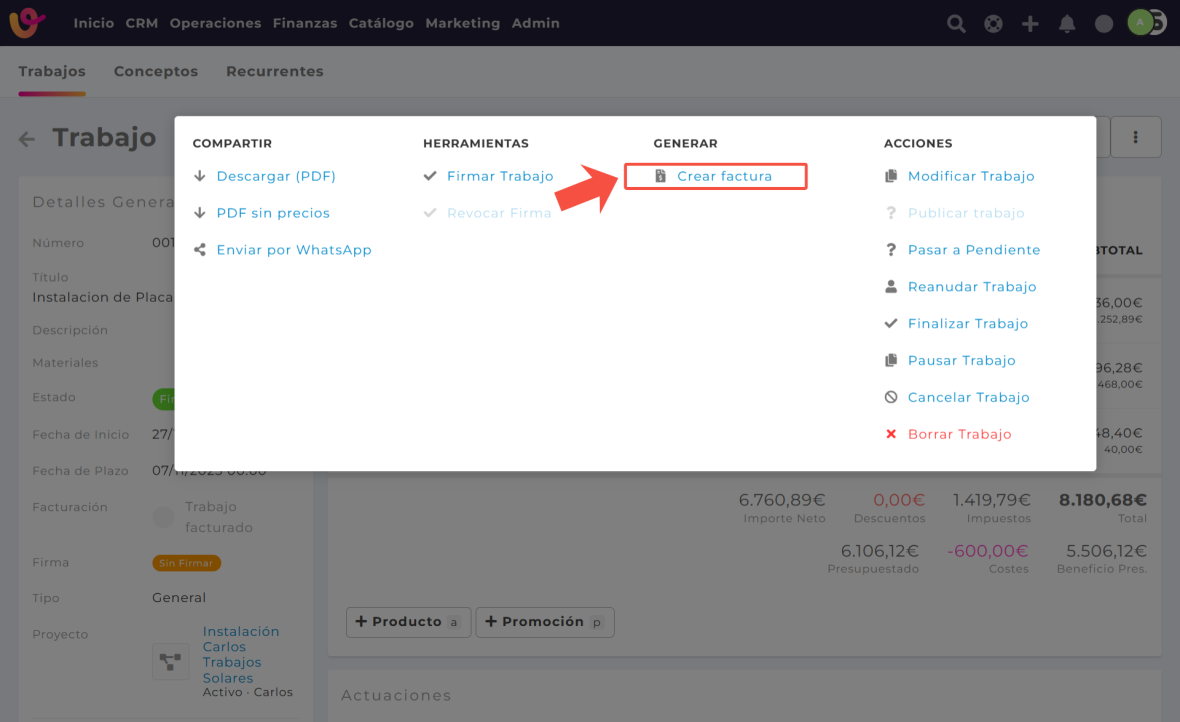 - Selecciona el trabajo que deseas facturar.