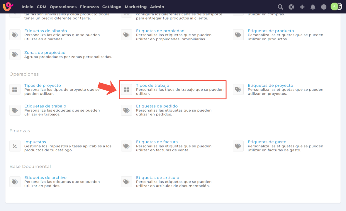En Vendomia puedes personalizar los tipos de trabajo para adaptarlos a la realidad de tu empresa, igual que sucede con los tipos de proyecto.