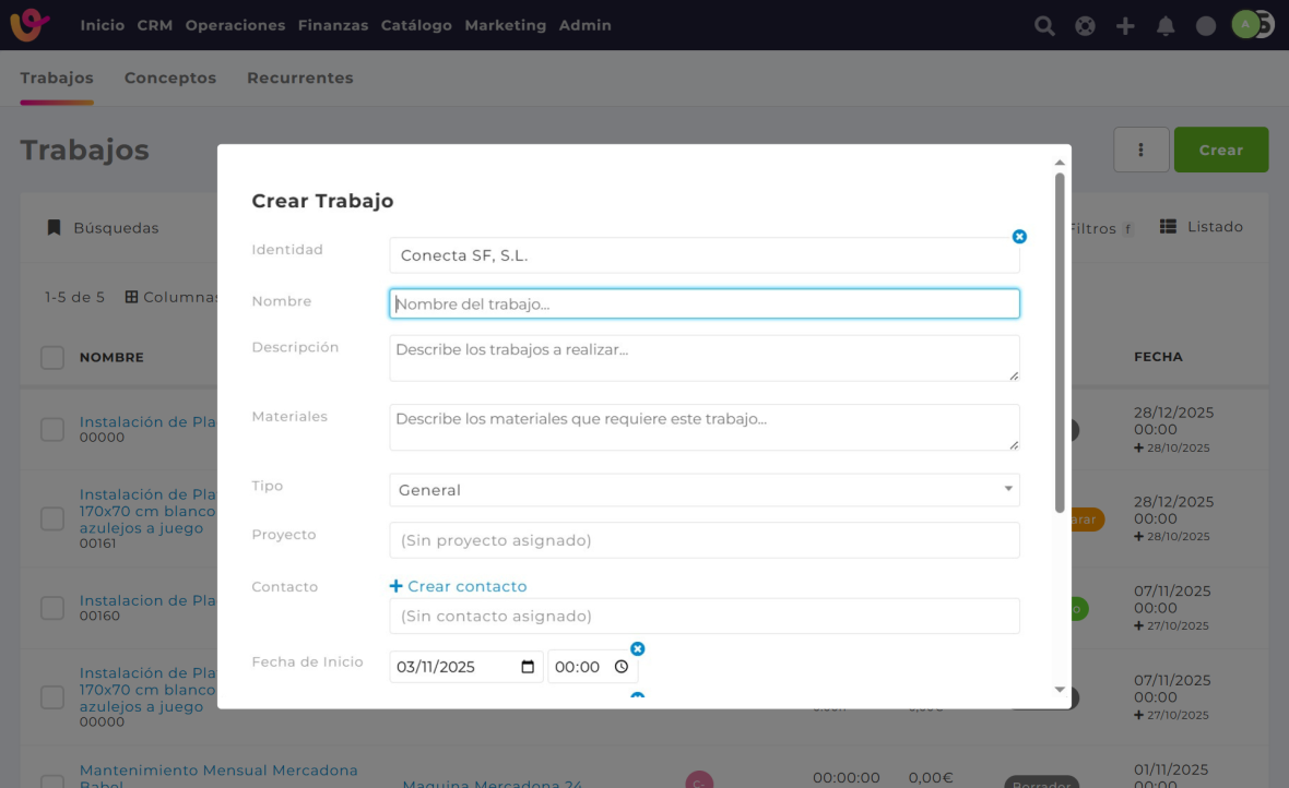 - Contacto: se completará automáticamente si el trabajo está vinculado a un cliente o proyecto.