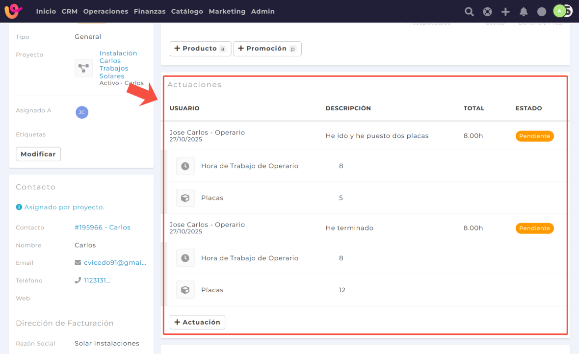 Las actuaciones permiten saber la cantidad de horas y material que han sido dedicadas a completar el trabajo. Es la principal herramienta que deben usar los trabajadores para registrar su jornada.