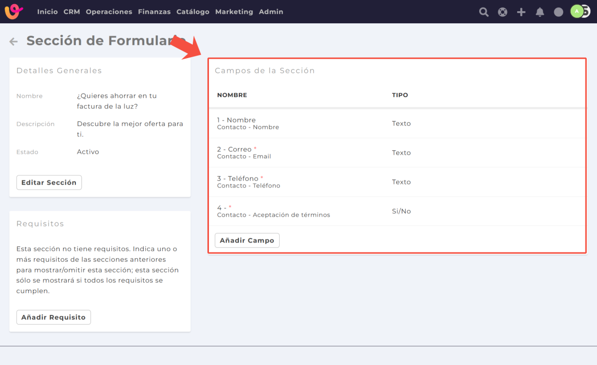 Dentro de cada sección podrás añadir los campos, que se corresponden a las preguntas, que desees incluir.