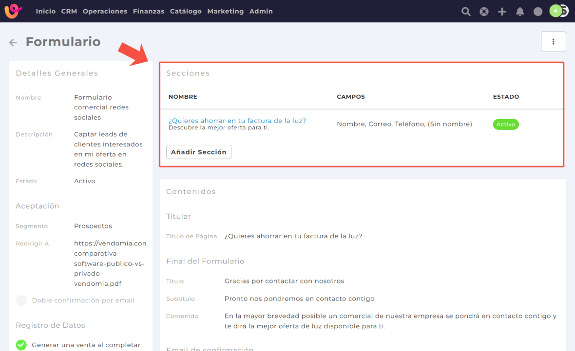 Cada vez que un usuario complete el formulario, la información se registrará directamente en Vendomia, generando un nuevo contacto y, si está configurado, una venta.