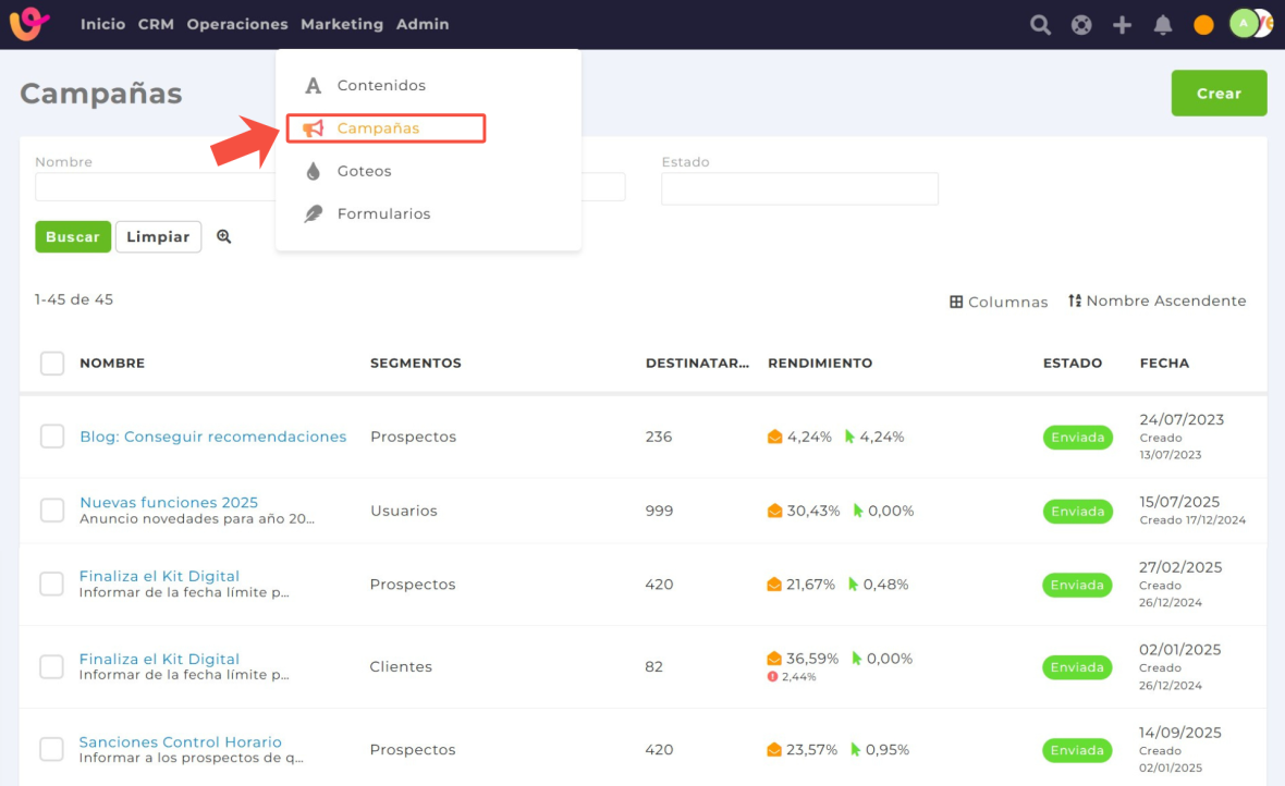 Para empezar, creas una nueva campaña desde el apartado de Marketing → Campañas.