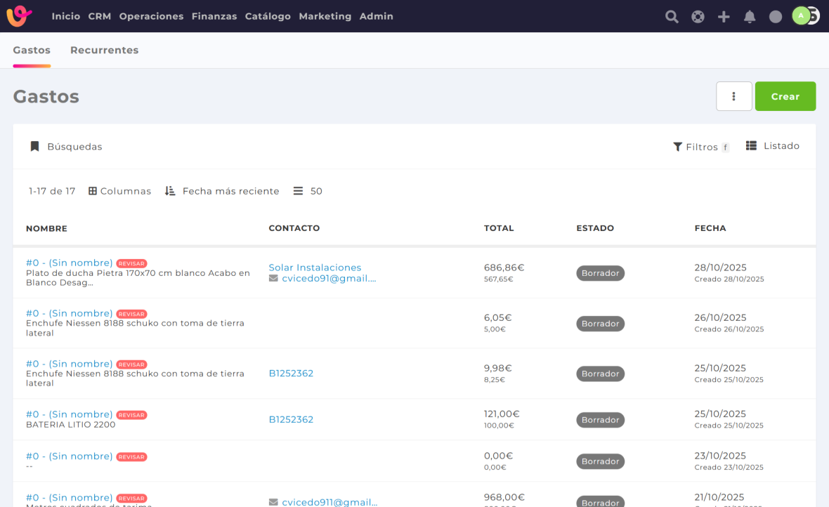 Cuando registras un gasto nuevo, este se guarda automáticamente en borrador, lo que te permite editarlo, añadir productos o modificar datos antes de publicarlo.