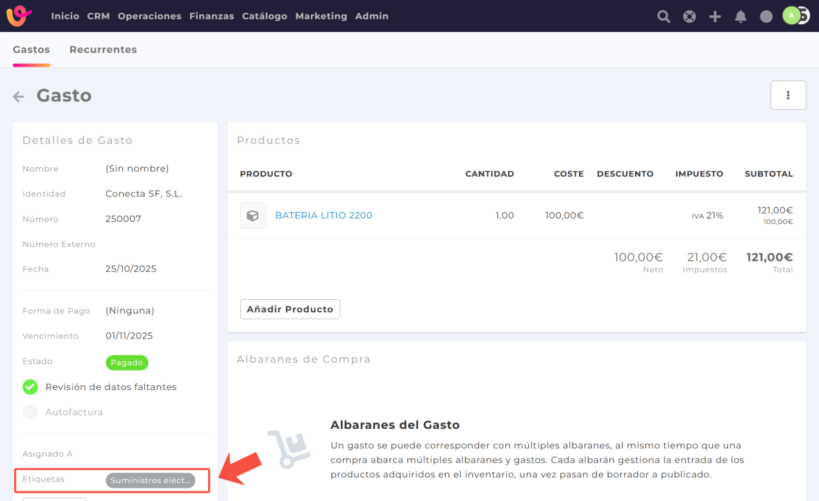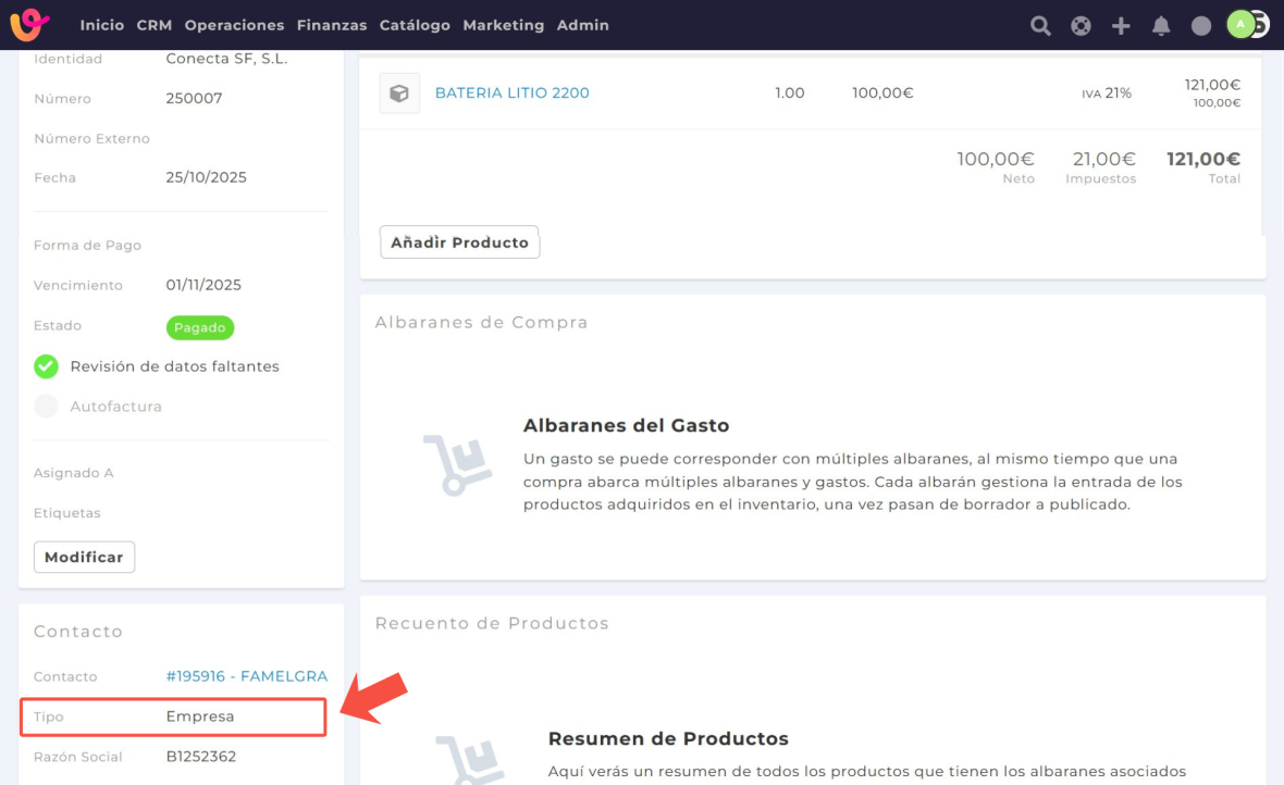 - Si el gasto está asociado a un contacto que tiene el tipo de proveedor de materiales, lo identificarás como un gasto de suministro o compra.