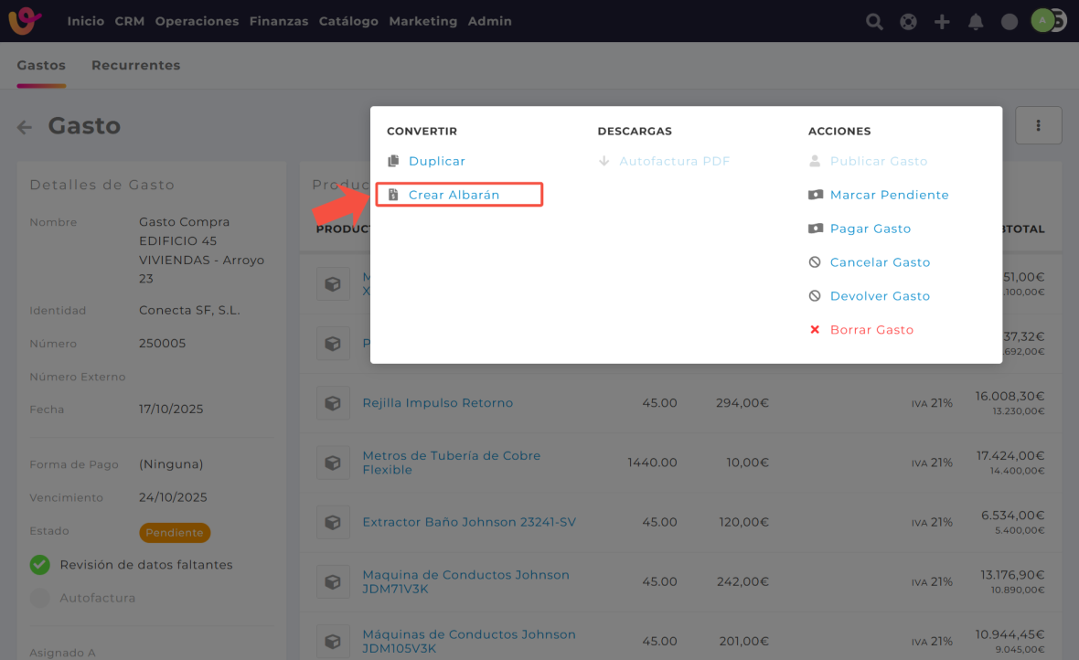- Dentro de la columna “Convertir”, selecciona la opción “Crear albarán”. Vendomia generará automáticamente un nuevo albarán basado en los datos del gasto que has seleccionado.
