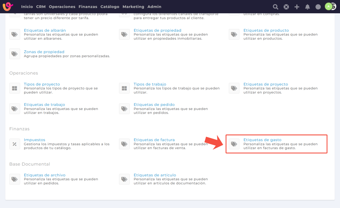 Dirígete a Admin → Configuración y, dentro del apartado de Finanzas, selecciona Etiquetas de gasto.