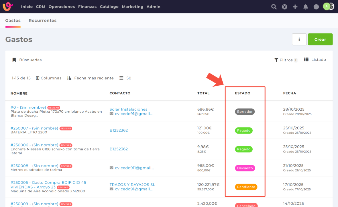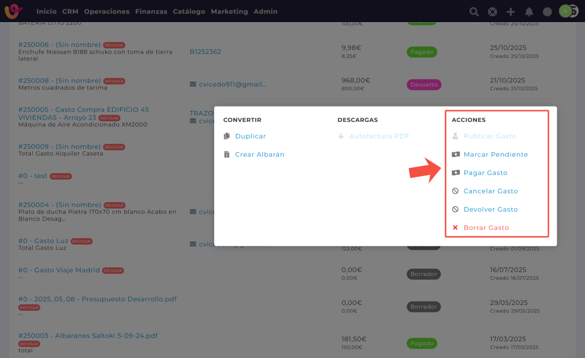 De esta manera, puedes actualizar el estado de tus gastos fácilmente desde el mismo panel, manteniendo siempre al día el control financiero de tu empresa.