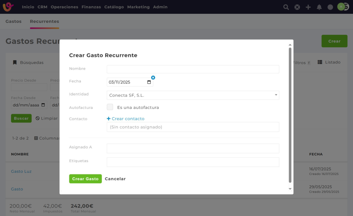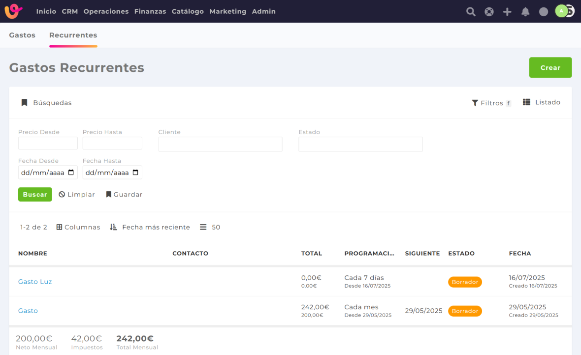 En lugar de crear manualmente estos gastos cada mes (o cada periodo que se repitan), Vendomia te permite automatizar su registro. De esta forma, ahorras tiempo y reduces errores administrativos.