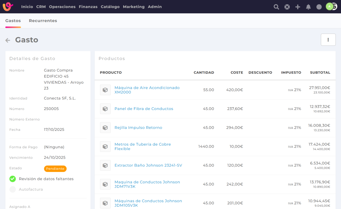 Cada gasto funciona como una factura de compra o gasto registrada dentro del sistema, vinculando sus importes con proyectos, compras o materiales específicos.