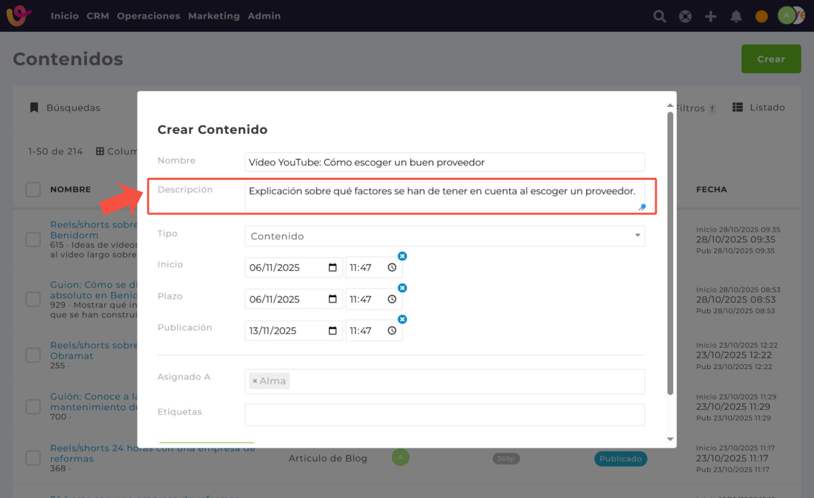 Esta clasificación te ayuda a identificar rápidamente el canal o formato al que pertenece cada publicación, facilitando la planificación y el seguimiento de tu estrategia de marketing.