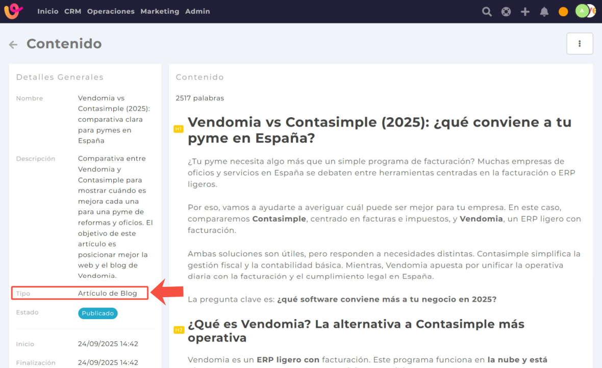 Por eso, Vendomia incorpora un apartado específico dentro del módulo de Marketing dedicado a los contenidos, pensado para ayudarte a organizar y planificar tus publicaciones de forma sencilla, sin necesidad de invertir grandes recursos.