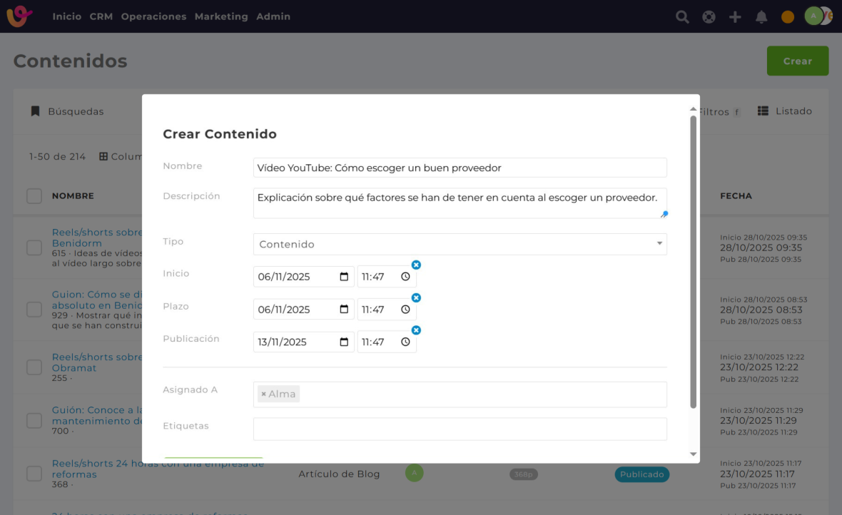 - Crear nuevos contenidos asignándoles un título y una fecha de publicación prevista.