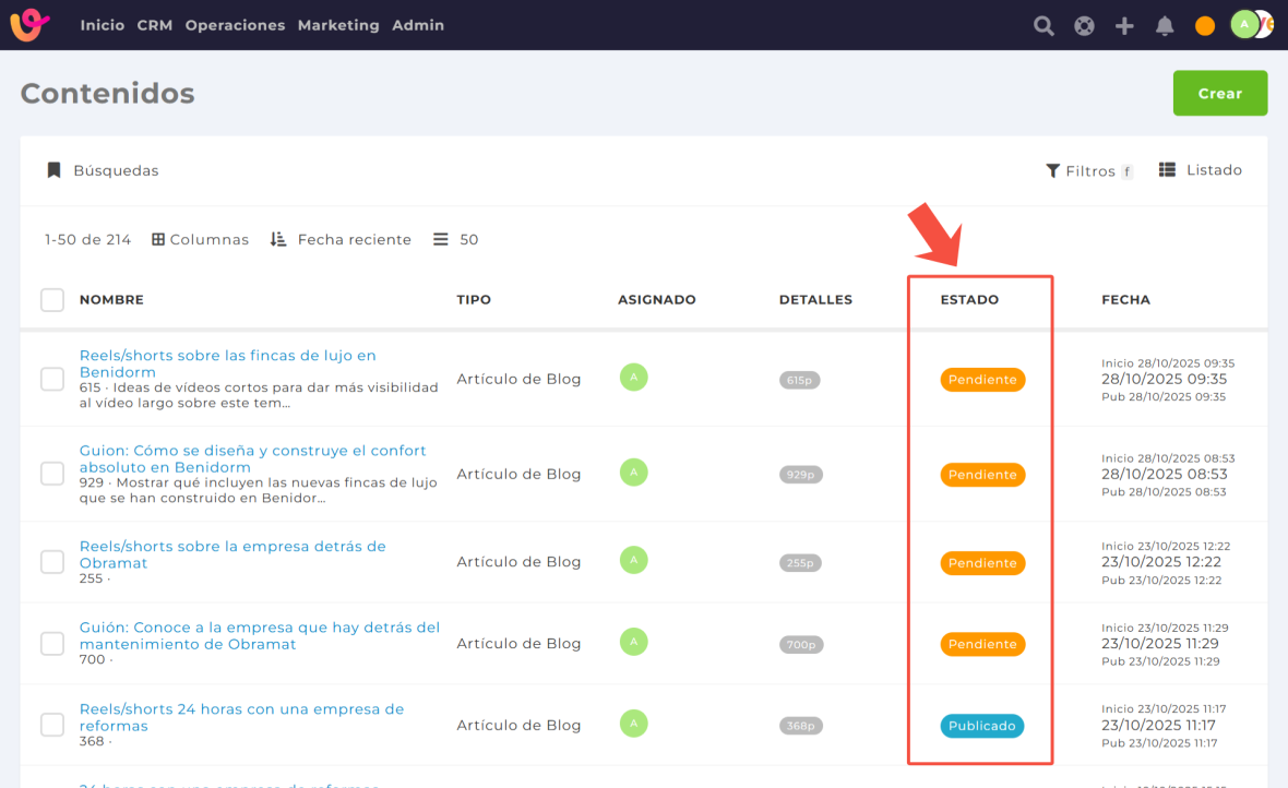 Cuando creas un nuevo contenido, este aparece inicialmente en estado Pendiente.