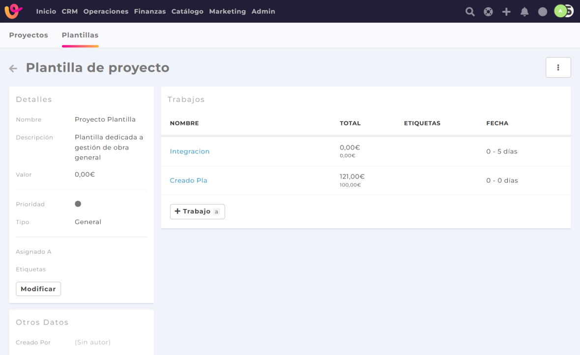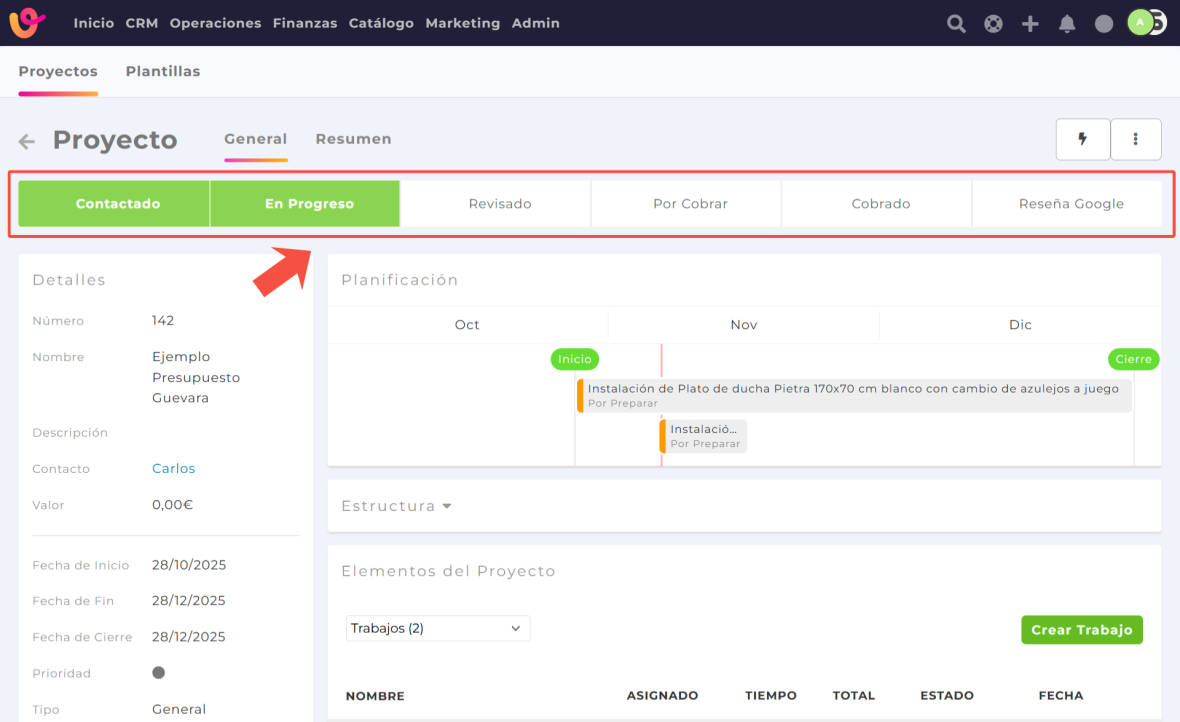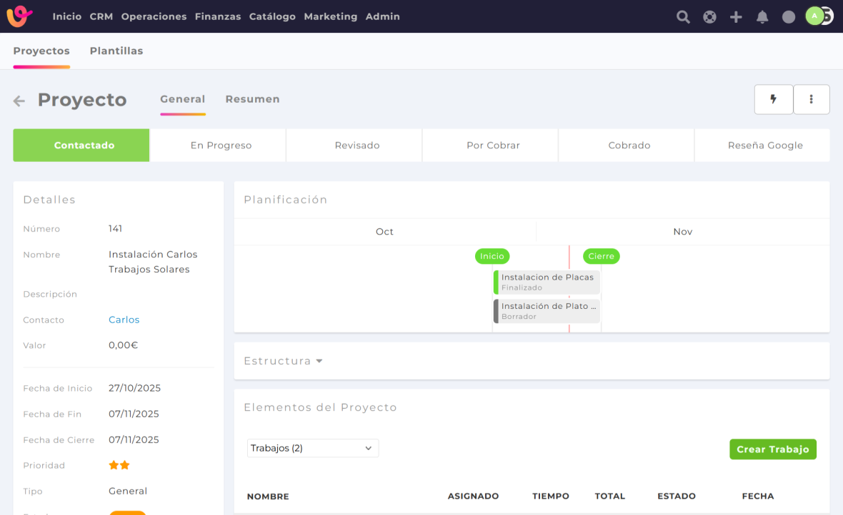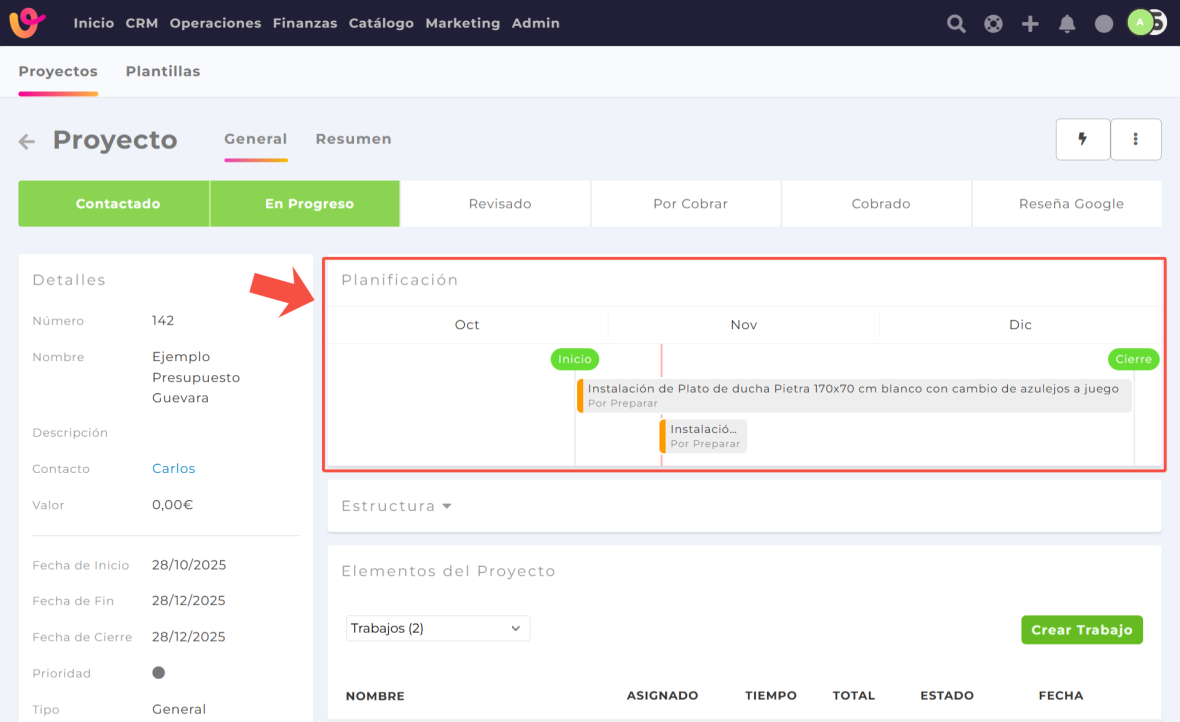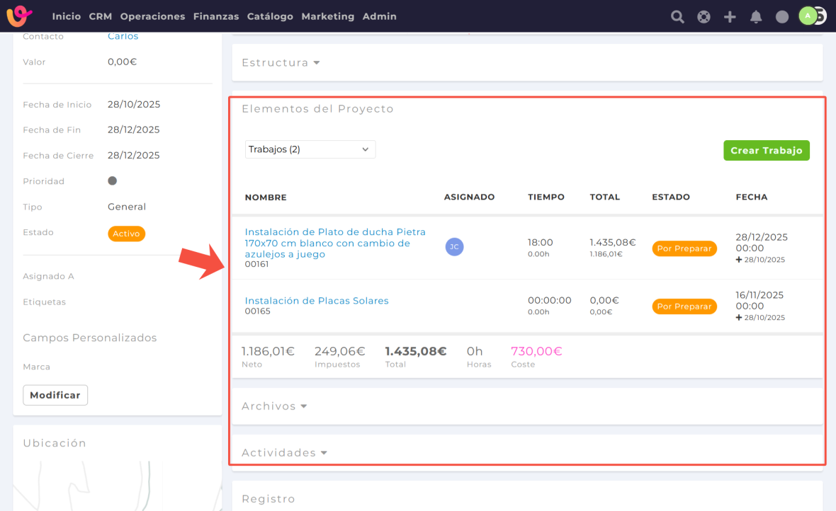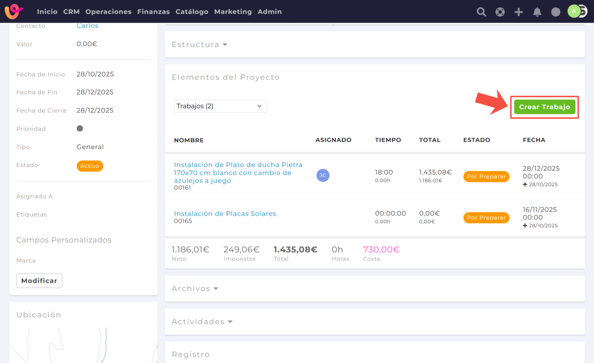 Una vez completados los campos, guarda y el nuevo trabajo quedará vinculado automáticamente al proyecto, integrándose en su planificación y seguimiento.