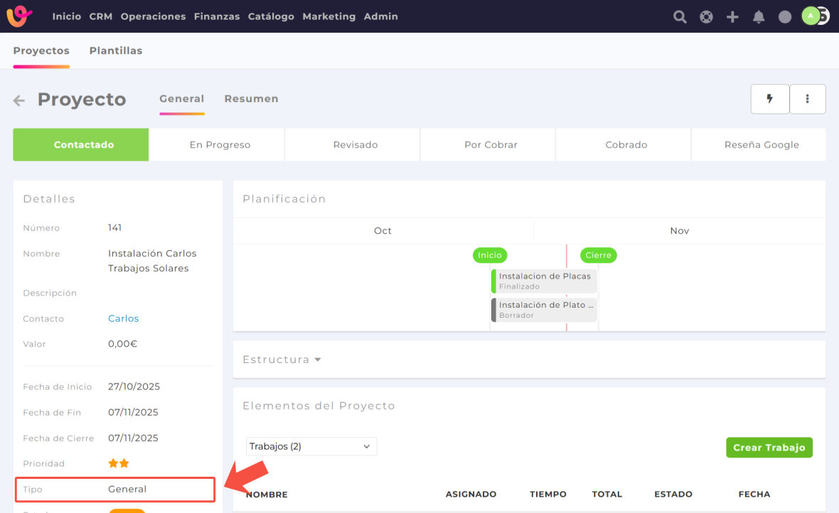 - Contacto: se rellena automáticamente con el cliente asociado al proyecto.