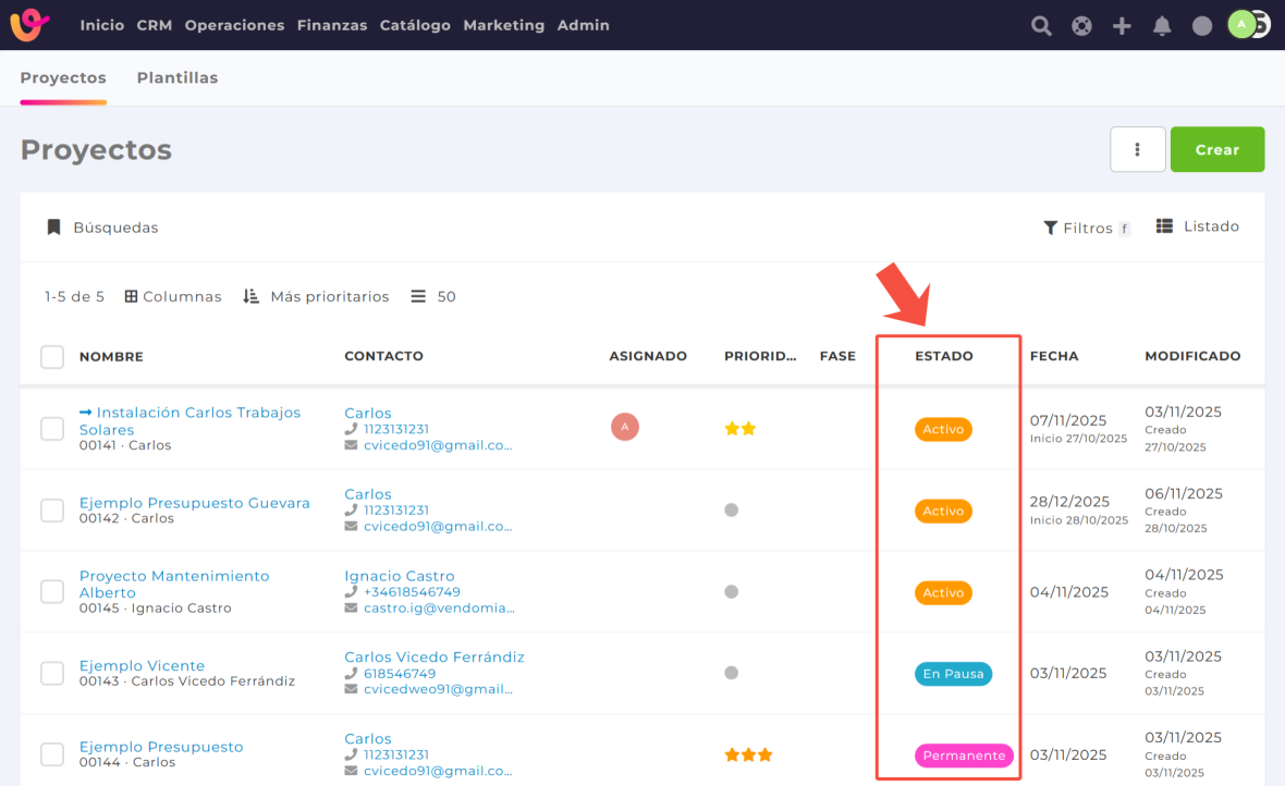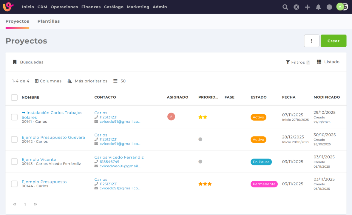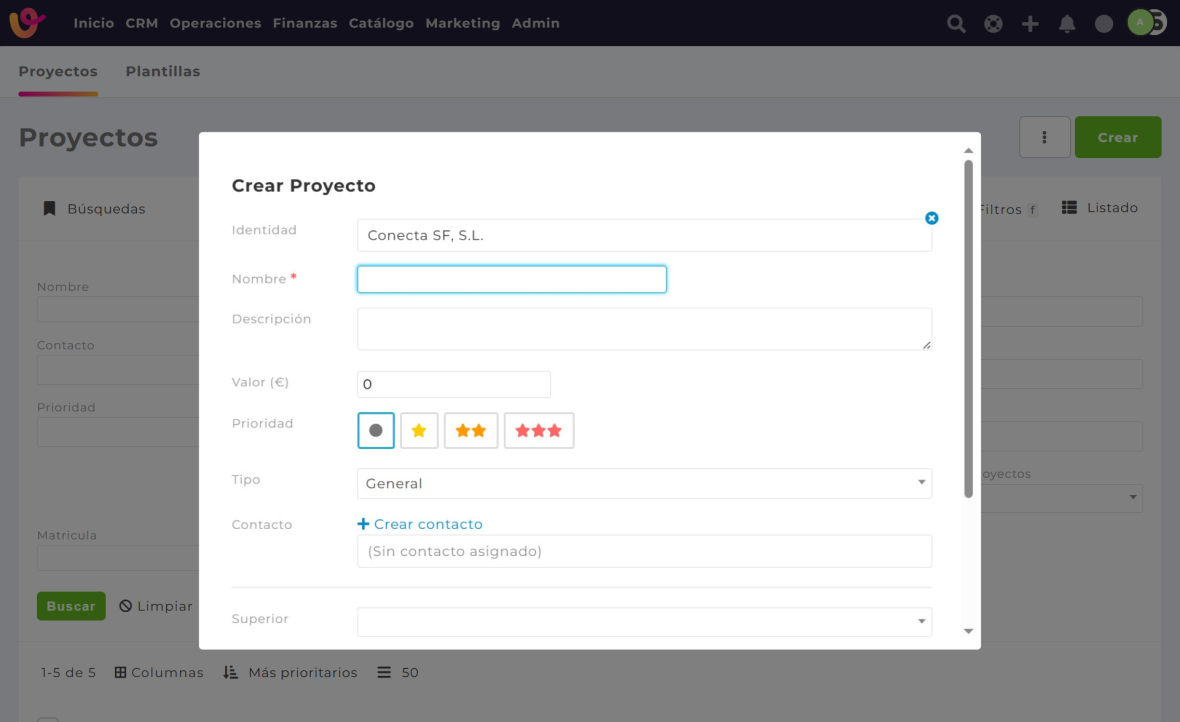 - Accede al menú principal y entra en Operaciones → Proyectos.