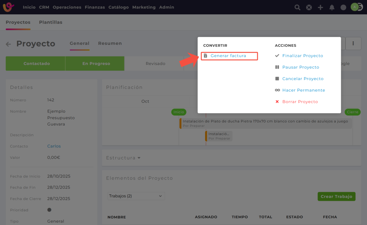 Si pinchas en los tres puntos de la esquina superior derecha, entre las opciones desplegables del proyecto, verás la opción Generar factura. Esta herramienta es simple pero potente, ya que permite tomar todos los trabajos pendientes de facturar y unirlos en una única factura de venta para el cliente.