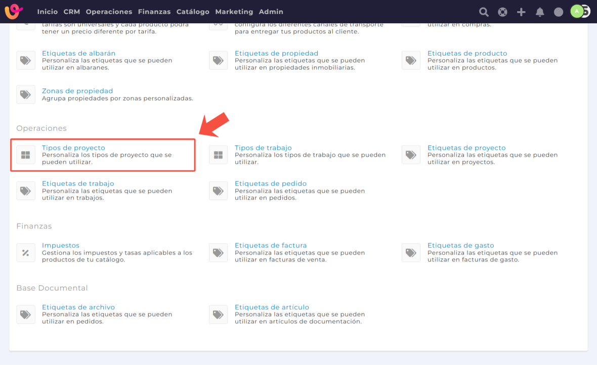 - En el apartado de configuración, busca y selecciona Tipos de proyecto o accdiendo a través del siguiente enlace: https://vendomia.app/project_types