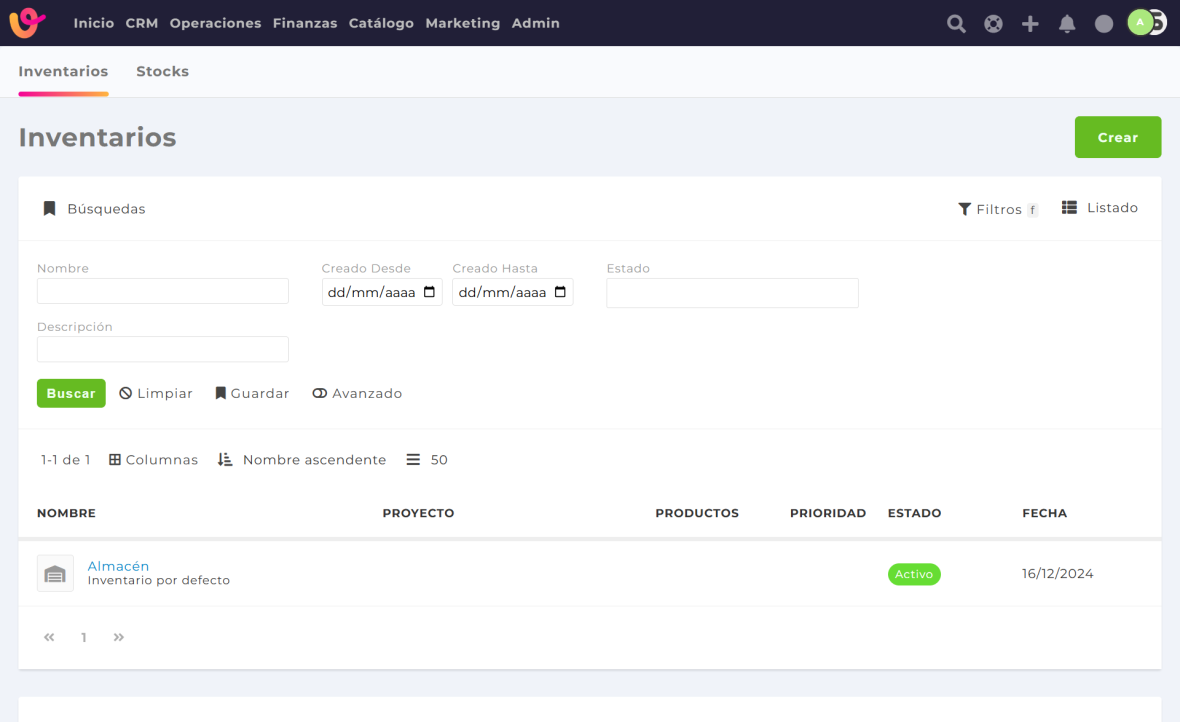 - Activo: el inventario se encuentra en uso y puede contener stocks de productos.