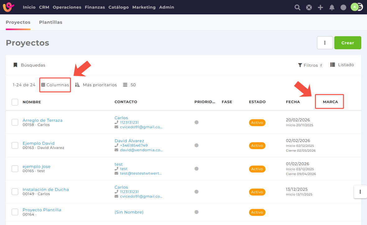 La función Columnas permite personalizar la información que aparece en las tablas de las diferentes secciones de Vendomia: Ventas, Contactos, Presupuestos, Proyectos, Trabajos, Facturas, entre otras.